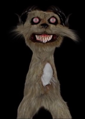 ピンク色の大きな目を見開いたとてつもない形相をしたパペット。